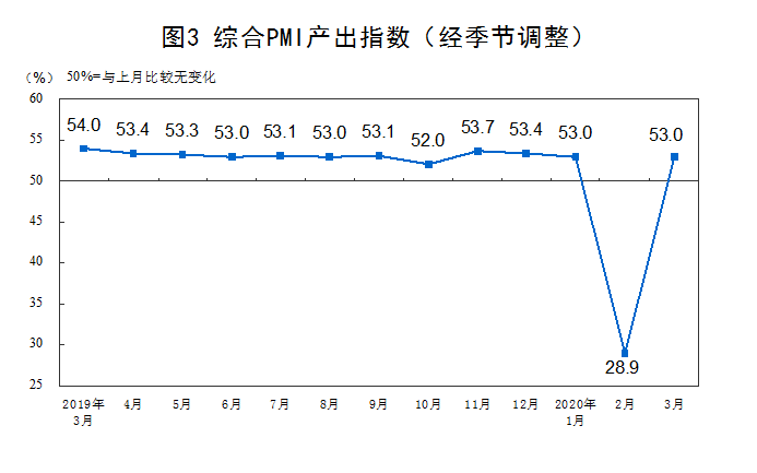 3月份,綜合PMI產(chǎn)出指數(shù)為53.0%,比上月回升24.1個百分點,表明我國企業(yè)生產(chǎn)經(jīng)營活動總體恢復較快。